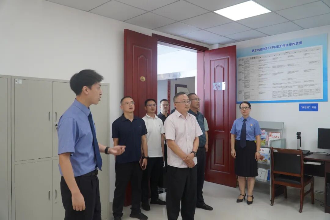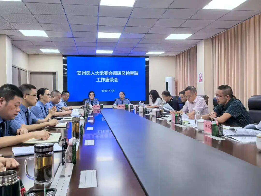 7月15日,安州区人大常委会党组书记、主任赵奎一行到区检察院专题调研并座谈。区人大常委会党组副书记、副主任刘云相主持座谈会,区检察院班子成员及中层以上干警参加座谈。 调研组实地考察了办案工作区、检察官办案单元、公诉人素能提升基地、院陈列室及图书漂流站等功能区域,详细了解了检察机关在规范化建设、队伍培养及机关文化建设等方面的工作成效及创新举措。 座谈会上,区检察院党组书记、检察长苏燕汇报了2025年以来检察工作总体情况;党组副书记、副检察长曾军专题汇报了2024年专项司法工作意见建议整改落实情况;党组成员、检委会专职委员沈强重点介绍了近三年未成年人检察工作的成效与亮点。与会代表结合履职实际和群众关切,围绕法律监督、民生保障、未成年人保护等工作进行交流并提出针对性意见建议。 赵奎主任充分肯定区检察院工作成效,他指出区检察院工作思路清晰、重点突出、特色鲜明、品牌亮眼、成效显著,在服务发展大局、践行司法为民中充分彰显了检察作为与担当。他强调,区检察院要持续以习近平法治思想为引领,筑牢政治根基;持续以服务经济社会发展为宗旨,形成履职合力;持续以提升检察办案水平为追求,加强队伍建设。 区检察院将以此次调研为契机,全面落实调研组指导意见,以更高站位服务发展大局,以更实举措回应群众期待,不断提升法律监督质效,切实履行好新时代检察机关的职责使命。