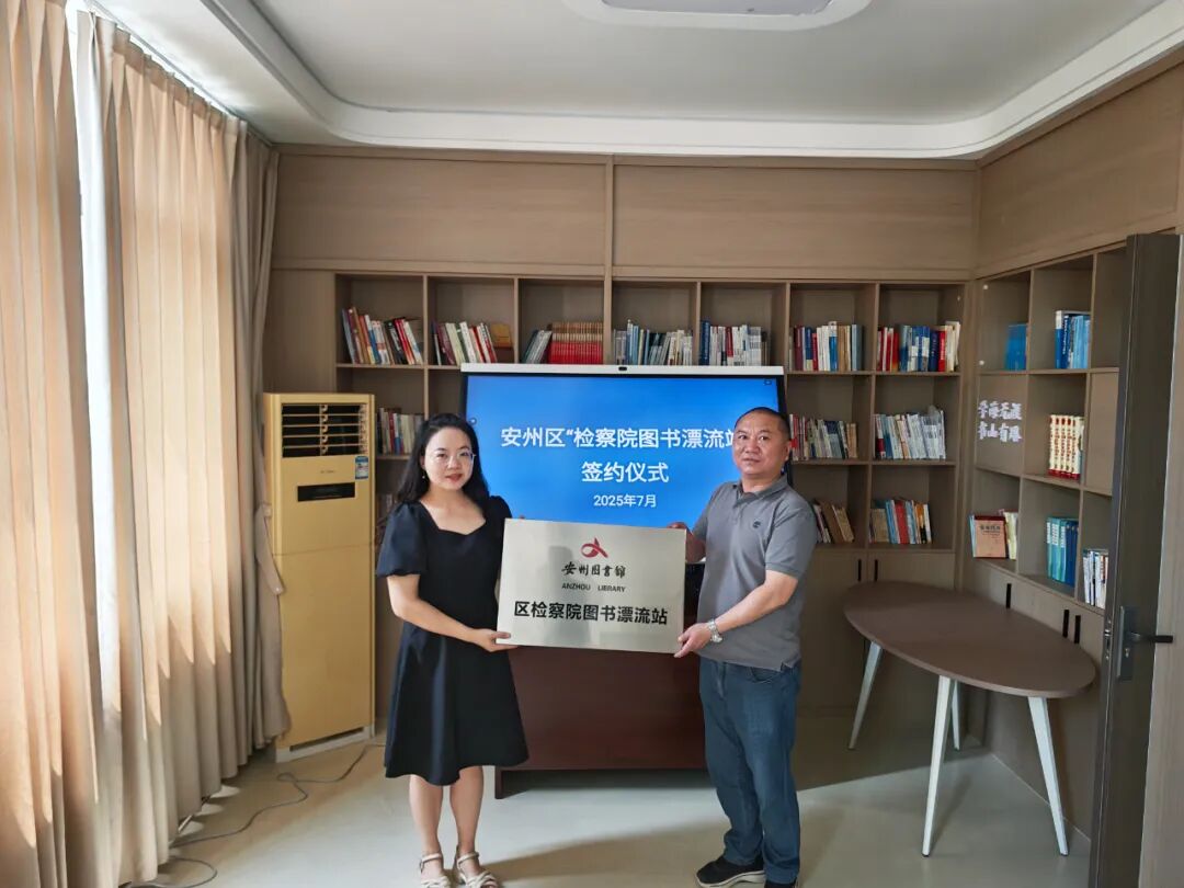 为创新法治宣传形式、丰富检察文化内涵,安州区检察院积极谋划并新成立了图书漂流站。7月10日,安州区检察院举行图书漂流站授牌仪式,安州区检察院图书漂流站成立,区文广旅局党组成员、旅游发展中心主任刘佳佳,区图书馆馆长方祎,区检察院党组副书记、副检察长曾军等人员参加授牌仪式。 活动现场,区图书馆馆长方祎和区检察院党组副书记、副检察长曾军共同签订共建合作协议,区文广旅局党组成员、旅游发展中心主任刘佳佳为图书漂流站授牌,并阐述图书漂流的意义与价值。她指出,区检察院成立图书馆漂流站是一项具有重要意义的工作,既丰富了公共文化服务的形式,又为法治宣传教育注入了新活力,希望区检察院以此为契机,充分发挥漂流站的作用。 授牌仪式后,区图书馆向区检察院交付了首批借阅302本图书、报刊,涵盖文学、历史、法律、科普等多个领域,为图书漂流站的顺利运营提供了有力支撑。这些书籍将在区检察院图书漂流站中流转,供检察干警阅读。 成立图书漂流站是区检察院文化建设和法治宣传工作的重要举措,区检察院将以此为平台,定期开展读书分享、法治讲座等活动,让漂流图书“活”起来,切实发挥其在提升干警素养、增强法治意识方面的作用,为建设法治社会、书香社会贡献检察力量。