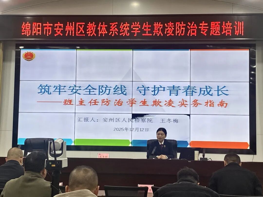 2025年12月12日上午,安州区检察院应邀为全区教育工作者开展学生欺凌防治专题培训。本次培训采用线上线下联动模式,在区教体局六楼会议室设主会场,各中小学(校区)设分会场,区教体局相关领导、各中小学负责人、班主任及相关管理人员共1000余人参训。 培训中,安州区检察院检察官王冬梅结合办案经历,以《筑牢安全防线 守护青春成长》为主题,聚焦教育工作者在欺凌防治中的核心职责,系统阐述学生欺凌的识别、干预、预防与联动的四大路径:一是“明察秋毫”,指导教师如何通过异常信号精准捕捉欺凌苗头;二是“果断介入”,明确分级处置流程与强制报告义务,强调欺凌处置的“四步法”;三是“润物无声”,从班级文化、法治教育、沟通机制等方面入手,构建预防欺凌的日常防线;四是“聚力同行”,倡导构建“学校-家庭-社会-司法”联动格局,形成协同共治的工作机制。 此次培训内容详实、重点突出,兼具法律专业性与教育实操性,为教育工作者对学生欺凌的识别、干预和预防提供了切实可行的工作指引。