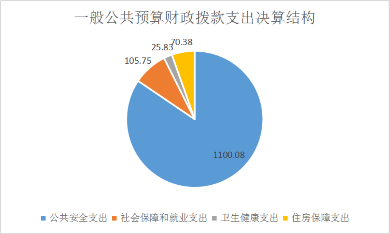 2024年一般公共预算财政拨款支出1302.04万元,主要用于以下方面公共安全支出1100.08万元,占84.49%;社会保障和就业支出105.75万元,占8.12%;卫生健康支出25.83万元,占1.98%;住房保障支出70.38万元,占5.41%。