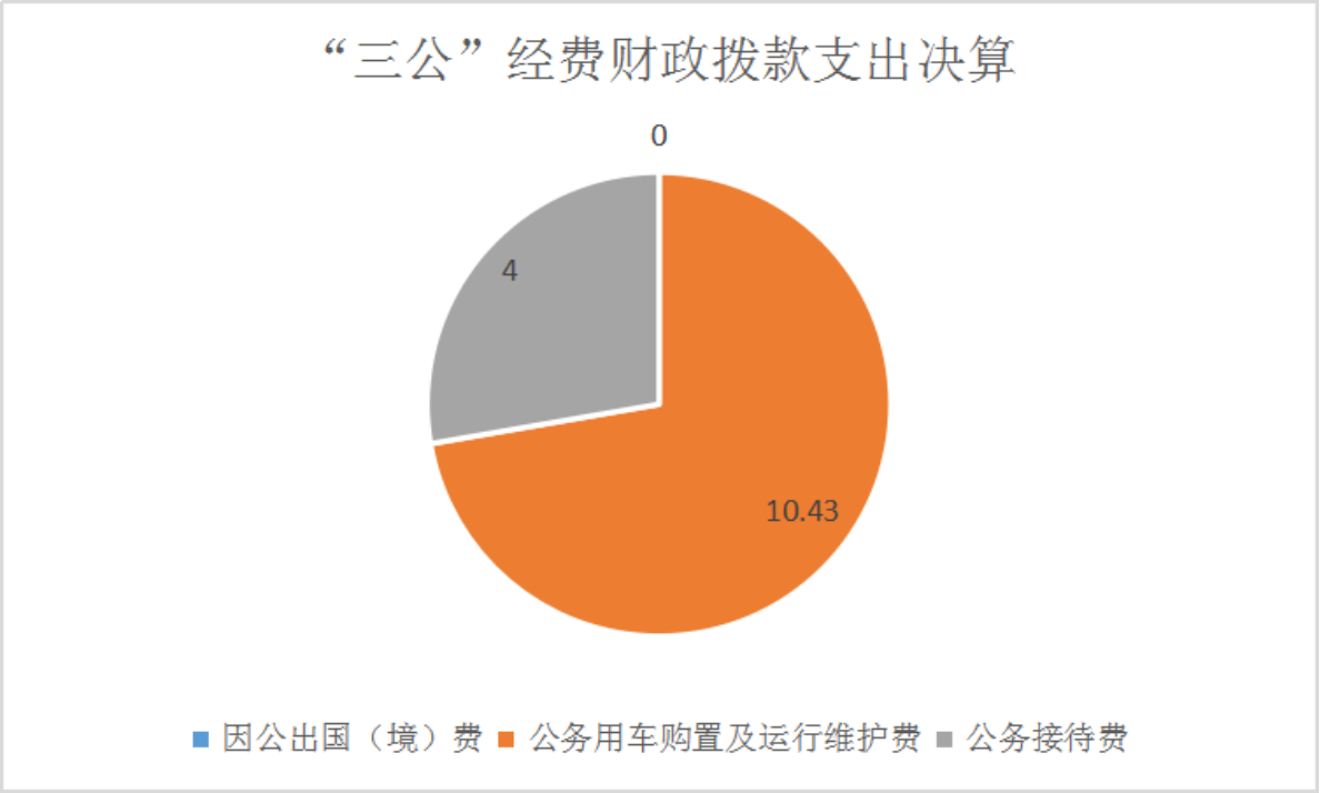 2024年“三公”经费财政拨款支出决算中,因公出国(境)费支出决算0万元,占0%;公务用车购置及运行维护费支出决算10.43万元,占72.28%;公务接待费支出决算4.0万元,占27.72%。